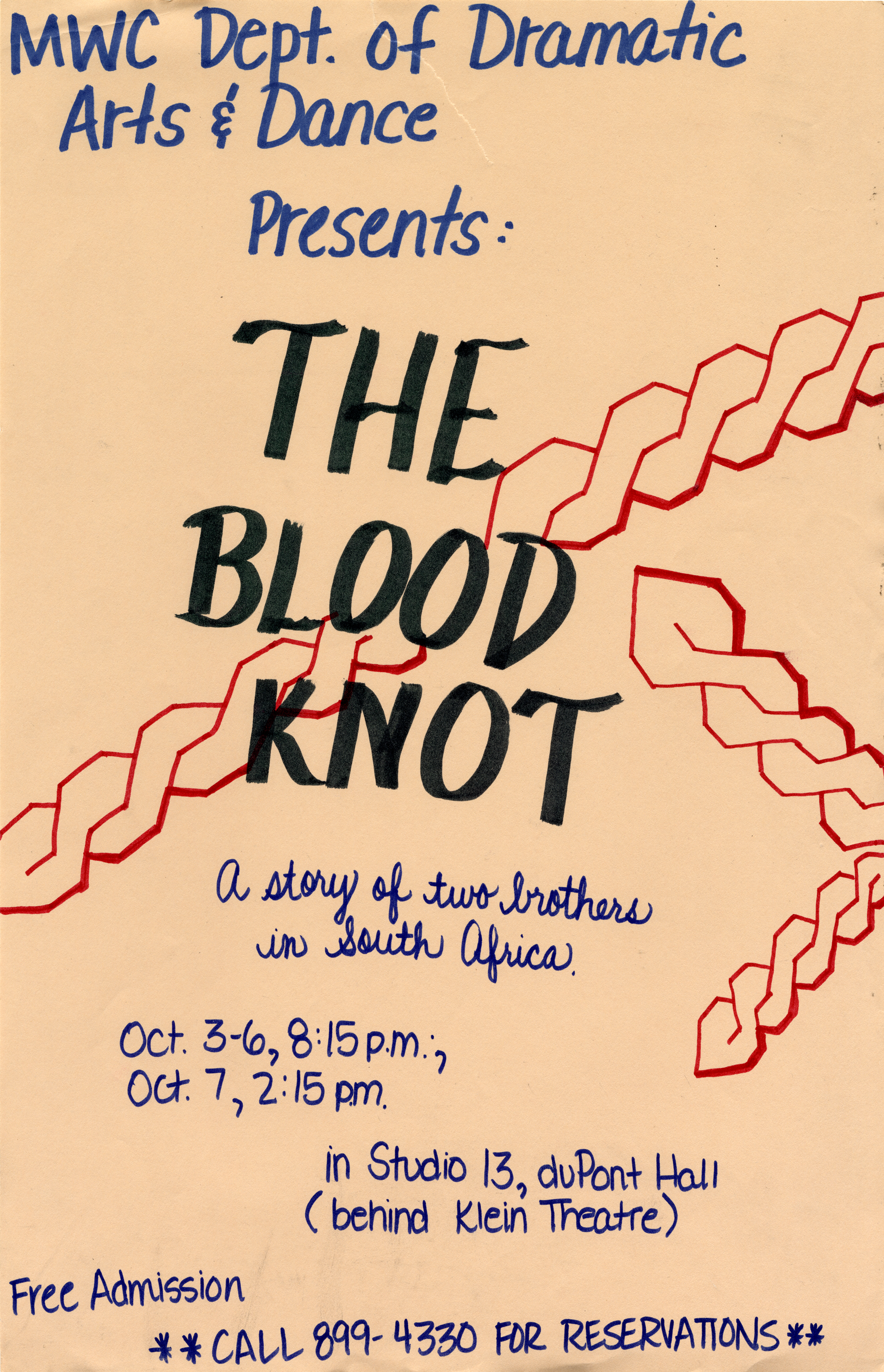 [Edit: I just noticed that the poster for “The Blood Knot” lists its venue as “Studio 13” — this was the slightly less than opulent stage better known as “The Black Box!” I had a hand-scrawled poster for it — I gave it to Russell Morgan when he graduated.]
