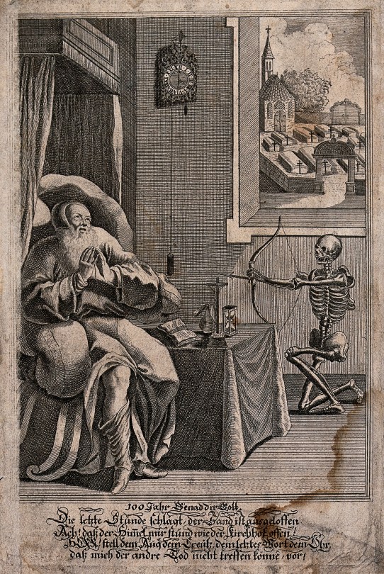 A man of a hundred years is Death’s target. Etching.